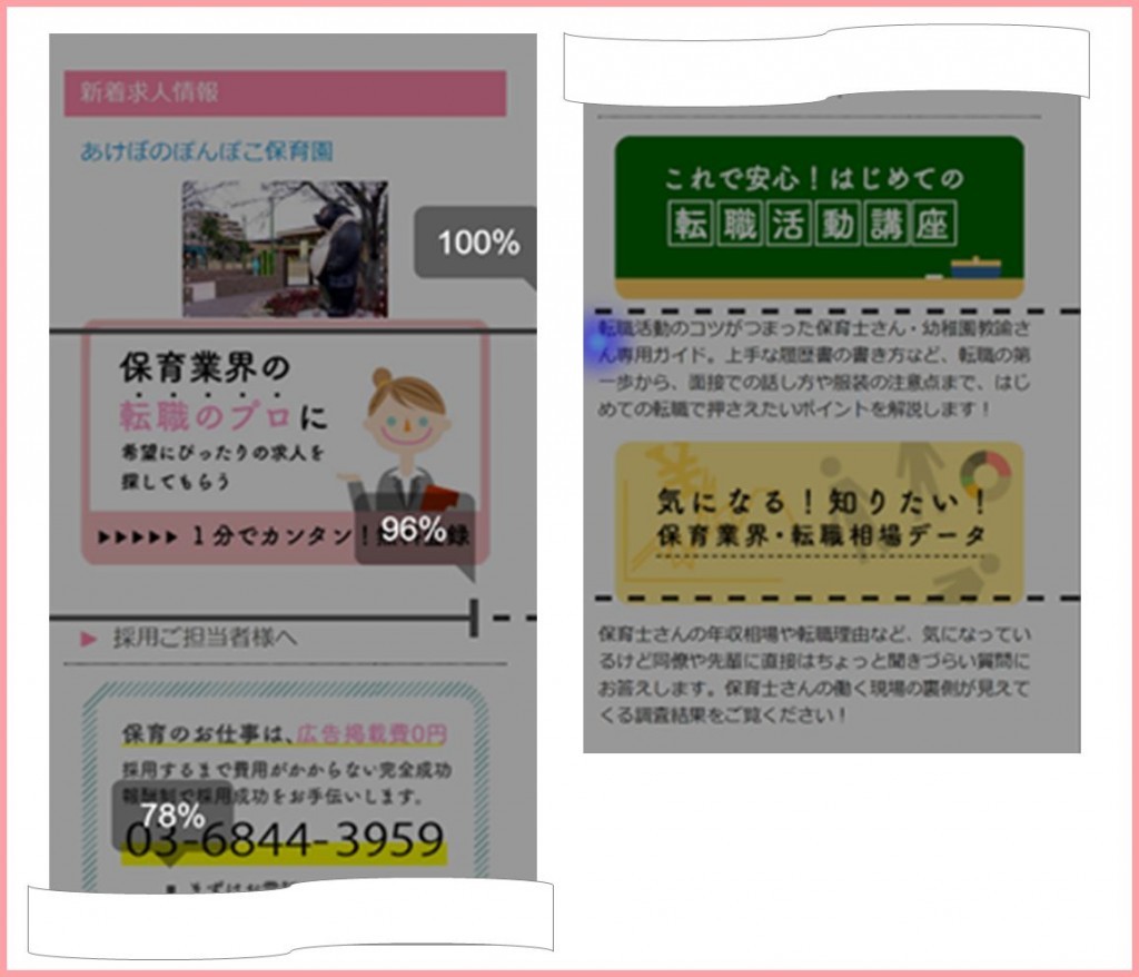 對banner左側的文字感興趣的用戶(hù)在頁(yè)面左側進(jìn)行了點(diǎn)擊。這些用戶(hù)沒(méi)有立即進(jìn)行職位檢索,他們對這個(gè)網(wǎng)站能做什么、是什么概念等等還抱有疑問(wèn)。也就是說(shuō)「適合自己的工作」是指的什么還不清晰。按照文字的介紹內容,把用戶(hù)引導到相關(guān)的內容頁(yè)是上佳修改選擇。另外,關(guān)于注冊按鈕做的更像按鈕的感覺(jué),在視覺(jué)上讓用戶(hù)一眼就看出來(lái)點(diǎn)擊此處會(huì )跳轉到注冊頁(yè)面。