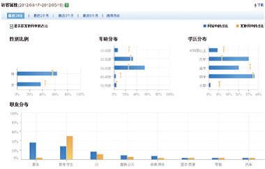 此處包括了訪(fǎng)客人口學(xué)屬性和訪(fǎng)客行為屬性。在百度統計中有【訪(fǎng)客屬性】報告展示了訪(fǎng)客人口學(xué)屬性;百度統計通過(guò)對您網(wǎng)站頁(yè)面長(cháng)期的監測,根據訪(fǎng)客的訪(fǎng)問(wèn)行為,判斷訪(fǎng)客的興趣愛(ài)好,進(jìn)而描述訪(fǎng)客的人口學(xué)屬性;通過(guò)數據可以獲得以下一些信息: