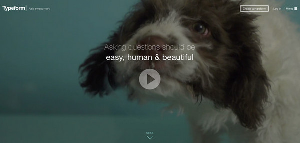 視頻和圖片巧妙地平鋪在Typeform的首頁(yè)上,配合著(zhù)沉浸式的幽靈按鈕,看起時(shí)尚而悅目。漂亮的字體樣式使得頁(yè)面的關(guān)鍵信息更加突出。