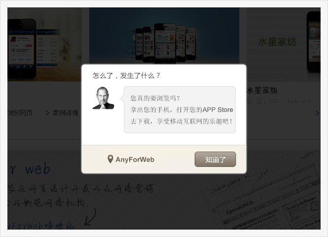 優(yōu)化后:形象化的對話(huà)框的使用,以及擬人化的對話(huà)拉近了與用戶(hù)之間的親和力,降低了用戶(hù)對彈出框的厭惡感,增加了對彈出框的接受度(喬布斯的頭像使用,更是額外的增加了幽默感)。