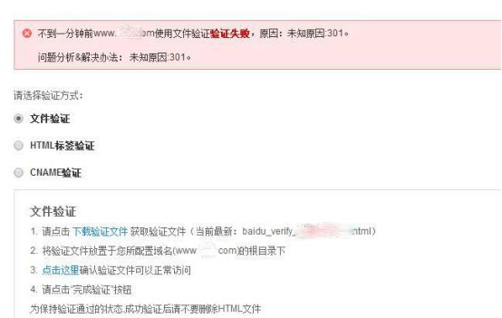文件驗證有時(shí)候也會(huì )出現驗證失敗的情況,例如首頁(yè)有跳轉,網(wǎng)頁(yè)速度打開(kāi)慢都有可能會(huì )出現驗證失敗的情況,下圖是有跳轉(301)的情況,遇到這樣的情況可以臨時(shí)修改服務(wù)器的配置,或者使用其它任意一種驗證方式。