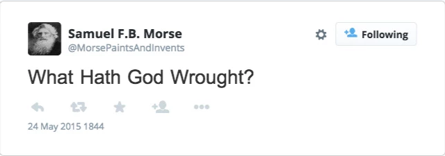 Dorsey和他的伙伴給這個(gè)名字又加了幾個(gè)元音字母,最終命名為T(mén)witter。這個(gè)名字本身也有含義。“這個(gè)單詞的意思就是‘嘰嘰喳喳地說(shuō)’和‘小鳥(niǎo)吱吱喳喳的叫聲’,這也正符合這個(gè)產(chǎn)品的特點(diǎn)”,Dorsey說(shuō)?;ヂ?lián)網(wǎng)發(fā)展的里程碑上將Dorsey發(fā)布的第一條tweet看作是社交媒體興起的一個(gè)轉折點(diǎn)。其實(shí)他們錯了。社交媒體真正的歷史起源于兩個(gè)世紀之前:1844年5月24號,一位曾經(jīng)是畫(huà)家的發(fā)明家Samuel F.B. Morse,從華盛頓向巴爾的摩發(fā)出了第一條信息。